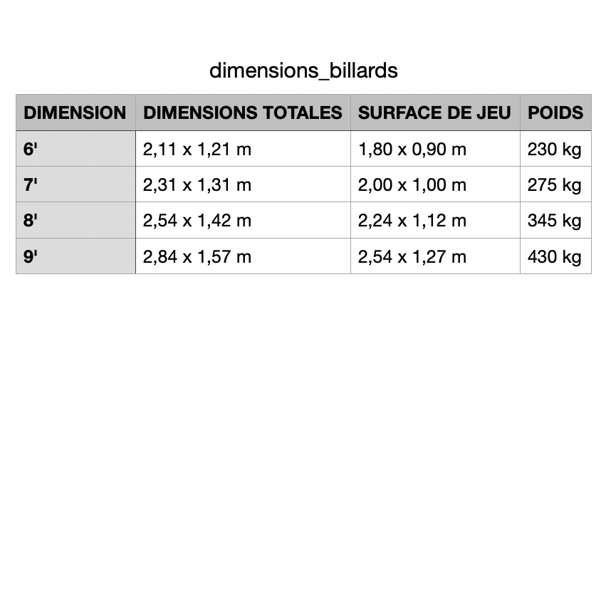 Dimensions et poids des billards